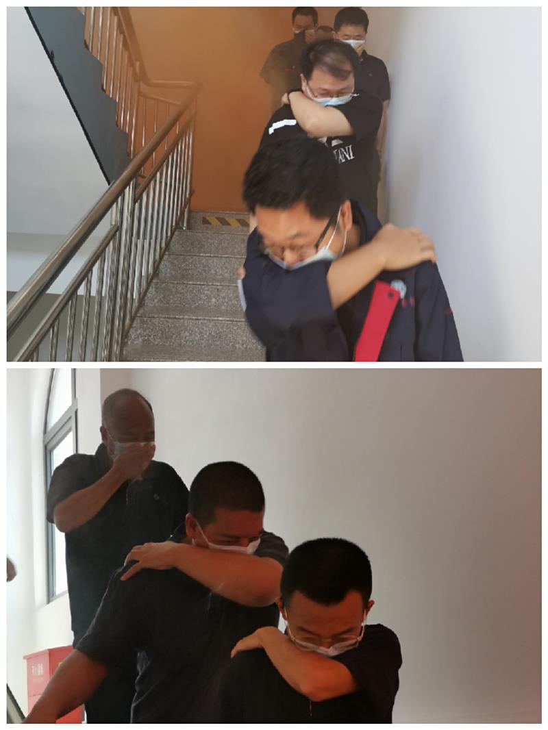 火災(zāi)警報(bào)響起后,疏散警戒組引導(dǎo)綜合辦公樓全體工作人員從安全通道緊張有序向廣場(chǎng)疏散,撤離完畢后由疏散警戒組組長(zhǎng)向指揮部報(bào)告火場(chǎng)疏散情況,總指揮根據(jù)“先救人后救火”原則下達(dá)火場(chǎng)搜救(滅火)指令。