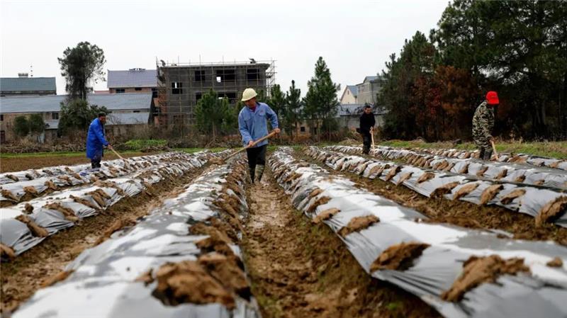 資料圖:2023年2月14日,在江西省吉安市峽江縣馬埠鎮(zhèn)朱家村,農(nóng)民在攤鋪薄膜(圖片來源:CFP)