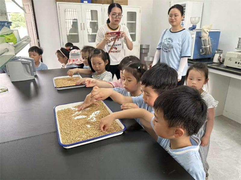 參觀完化驗(yàn)室后安溪直屬庫工作人員帶領(lǐng)孩子們繞糧庫一周,參觀了庫區(qū)內(nèi)的機(jī)器設(shè)備,也近距離觀看了小麥出倉全過程,全程科技感滿滿,孩子們親身感受到了儲存糧食的智慧;隨后在安溪直屬庫工作人員的帶領(lǐng)下孩子們進(jìn)入小麥倉、稻米倉與糧食親密接觸,通過伸手摸一摸,鼻子聞一聞,放眼看一看等方式了解糧食的外形、顏色、質(zhì)感等特點(diǎn)。安溪直屬庫保管員用通俗易懂的語言為小朋友們解釋了糧食儲備的重要性以及糧食儲藏需要考慮溫度、濕度等不同條件因素,而這些都需要通過技術(shù)手段實(shí)現(xiàn),體會到了儲糧不易。