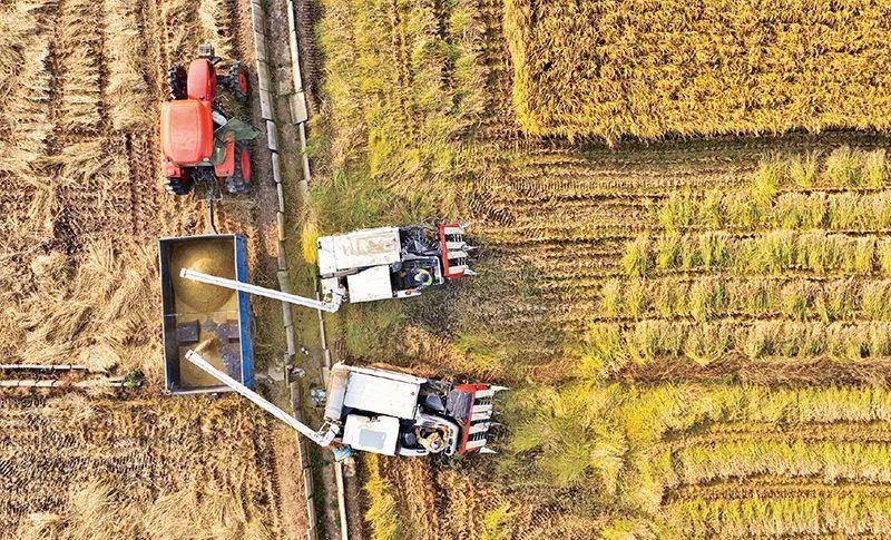 2023年,我國(guó)糧食總產(chǎn)量再創(chuàng)歷史新高,連續(xù)9年保持在1.3萬億斤以上。圖為2023年10月12日,在遼寧省燈塔市東古城子村,水稻收割機(jī)將收割的稻谷裝車。新華社記者 楊青/攝