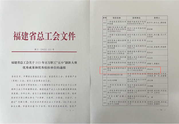 近日,福建省總工會發(fā)布了福建省2023年百萬職工“五小”創(chuàng)新大賽優(yōu)秀成果名單,南安直屬庫卓成加同志申報的《糧食振動篩篩網提升改造》項目榮獲優(yōu)秀成果三等獎。