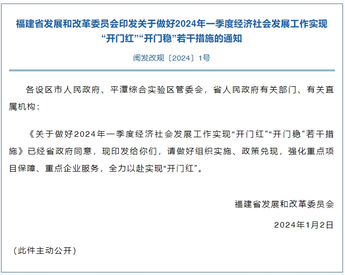 福建省發(fā)展和改革委員會(huì)印發(fā)關(guān)于做好2024年一季度經(jīng)濟(jì)社會(huì)發(fā)展工作實(shí)現(xiàn)“開(kāi)門(mén)紅”“開(kāi)門(mén)穩(wěn)”若干措施的通知