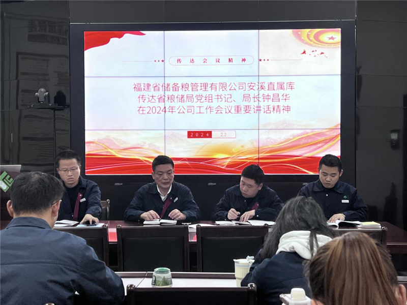2月2日下午,安溪直屬庫召開全體員工會議,葉宗清主任及時傳達了省糧儲局黨組書記、局長鐘昌華同志在1月30日省公司2024年工作會議上的重要講話精神及2024年工作會議精神。