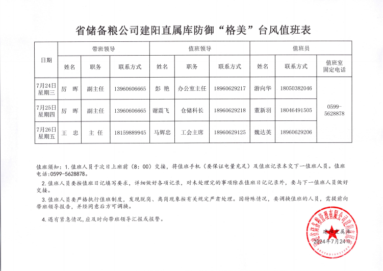 同時建陽庫嚴(yán)格執(zhí)行防汛防臺風(fēng)值班和領(lǐng)導(dǎo)帶班制度,強化人員值班,確保通訊暢通、響應(yīng)及時。值班人員時時關(guān)注臺風(fēng)情況,加強對倉房、辦公區(qū)域等重點部位的巡查,以便及時處理排水口堵塞等各類突發(fā)情況,確保糧食儲存安全,做到人安、糧安、庫安。