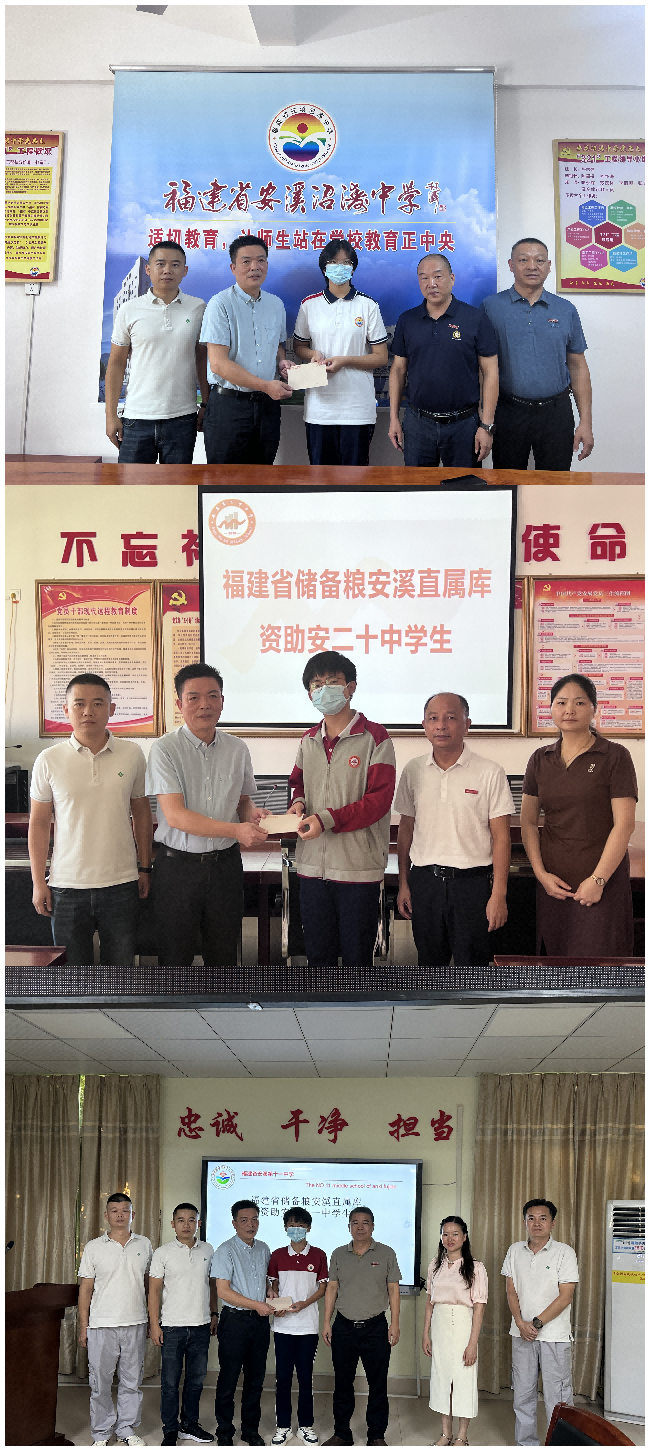 為弘揚(yáng)新時(shí)代文明風(fēng)尚,助力家境困難學(xué)生完成學(xué)業(yè)逐夢前行,9月11日,安溪直屬庫黨支部組織志愿者前往安溪第二十中學(xué)、安溪沼濤中學(xué)、安溪第十一中學(xué),開展“金秋助學(xué) 筑夢前行”志愿服務(wù)活動(dòng),為3名家境困難的學(xué)生送去助學(xué)金。