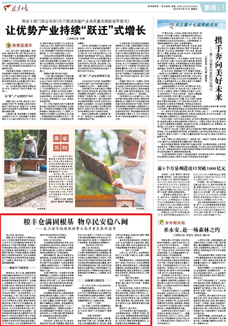 6月13日,福建日報3版刊發(fā)《糧豐倉滿固根基 物阜民安穩(wěn)八閩——奮力譜寫福建糧儲事業(yè)高質(zhì)量發(fā)展新篇章》