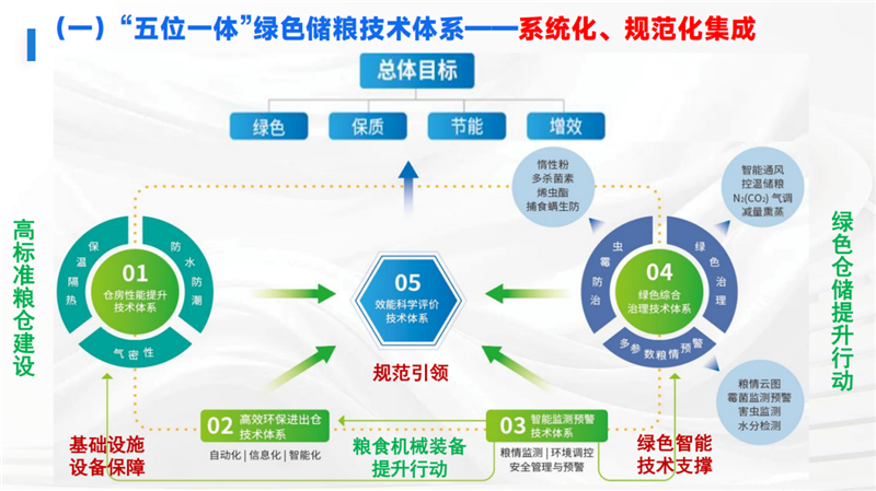 “五位一體”綠色儲糧技術(shù)體系是國家糧食和物資儲備局為深入貫徹習(xí)近平總書記關(guān)于保障國家糧食安全的重要指示批示精神,聚焦“十五五”綠色、智能發(fā)展方向,提出的以倉房性能提升、高效環(huán)保進出倉、智能監(jiān)測預(yù)警、綠色綜合治理、效能科學(xué)評價為核心的綠色儲糧技術(shù)體系,旨在解決我國不同儲糧生態(tài)區(qū)綠色儲糧新技術(shù)應(yīng)用規(guī)范性弱、集成度不高、系統(tǒng)性不強等問題。